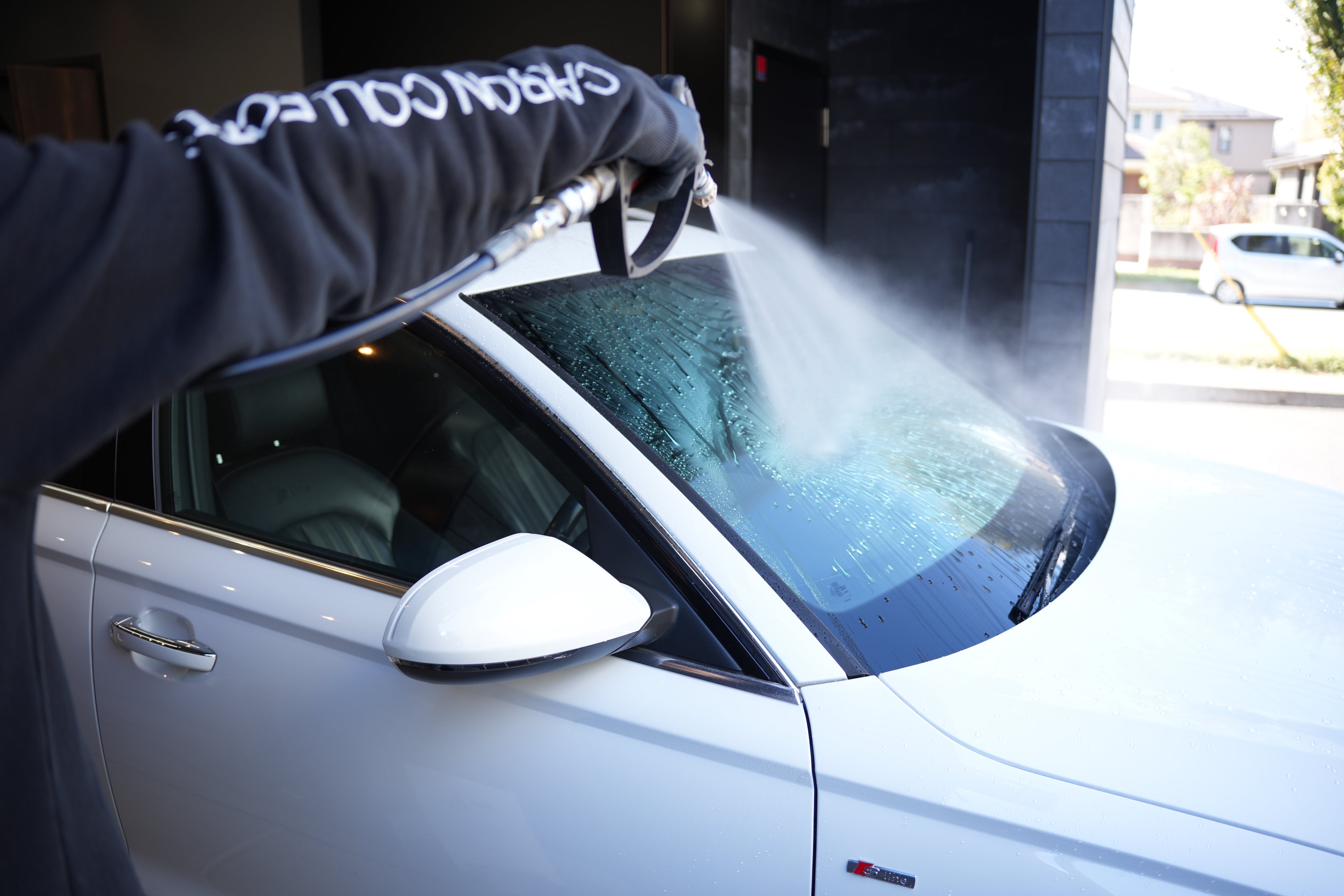 カーシャンプーには界面活性剤を含んでいるので、シャンプー液が車両表面に残留してしまわないように上から下に流すことを意識しながらすすいでいくのがポイントです。