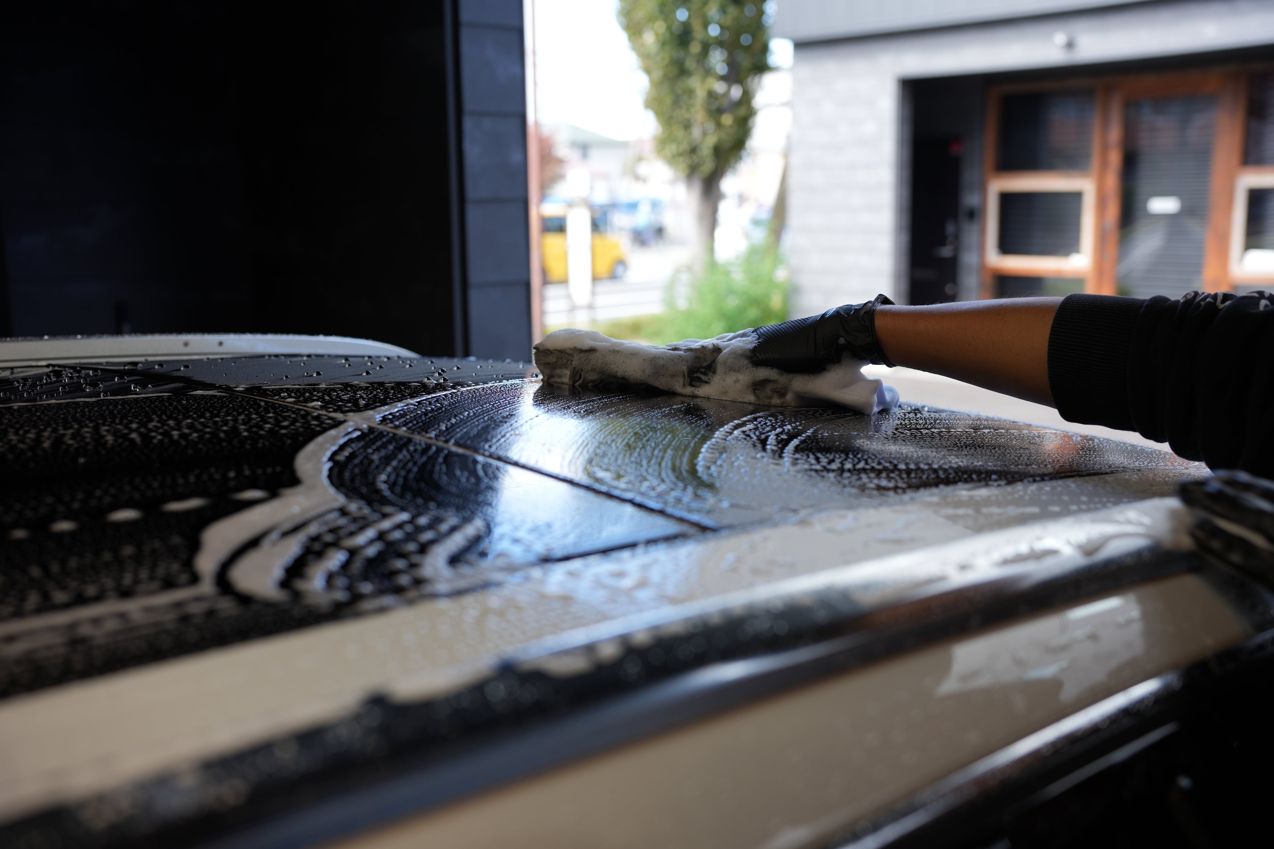 足回りが終わったら、ボディの洗浄に入っていきます。洗車用のシャンプーとウォッシュミットを使用し、汚れを優しく取り除きます。